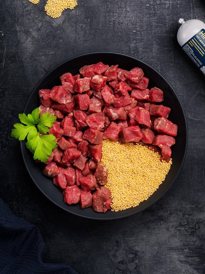 Leicht verdauliches Hundefutter mit hohem Lammanteil, Hirse & einem Schuss Leinöl – lecker, bekömmlich und alltagstauglich.