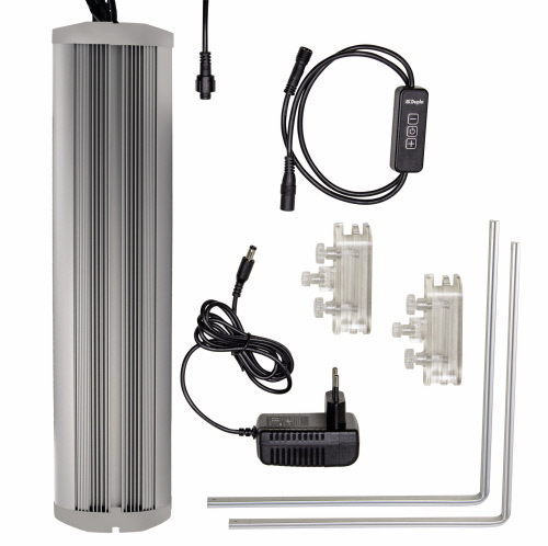 • zwei LED Kanäle, Tageslicht und Actinic blue, mit beiliegendem Controller regelbar