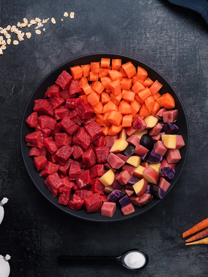 Saftiges Rind-Menü mit leckerem Pansen, Gemüse und Haferflocken – besonders schmackhaft, gut portionierbar und ideal als tägliche Mahlzeit für Hunde.