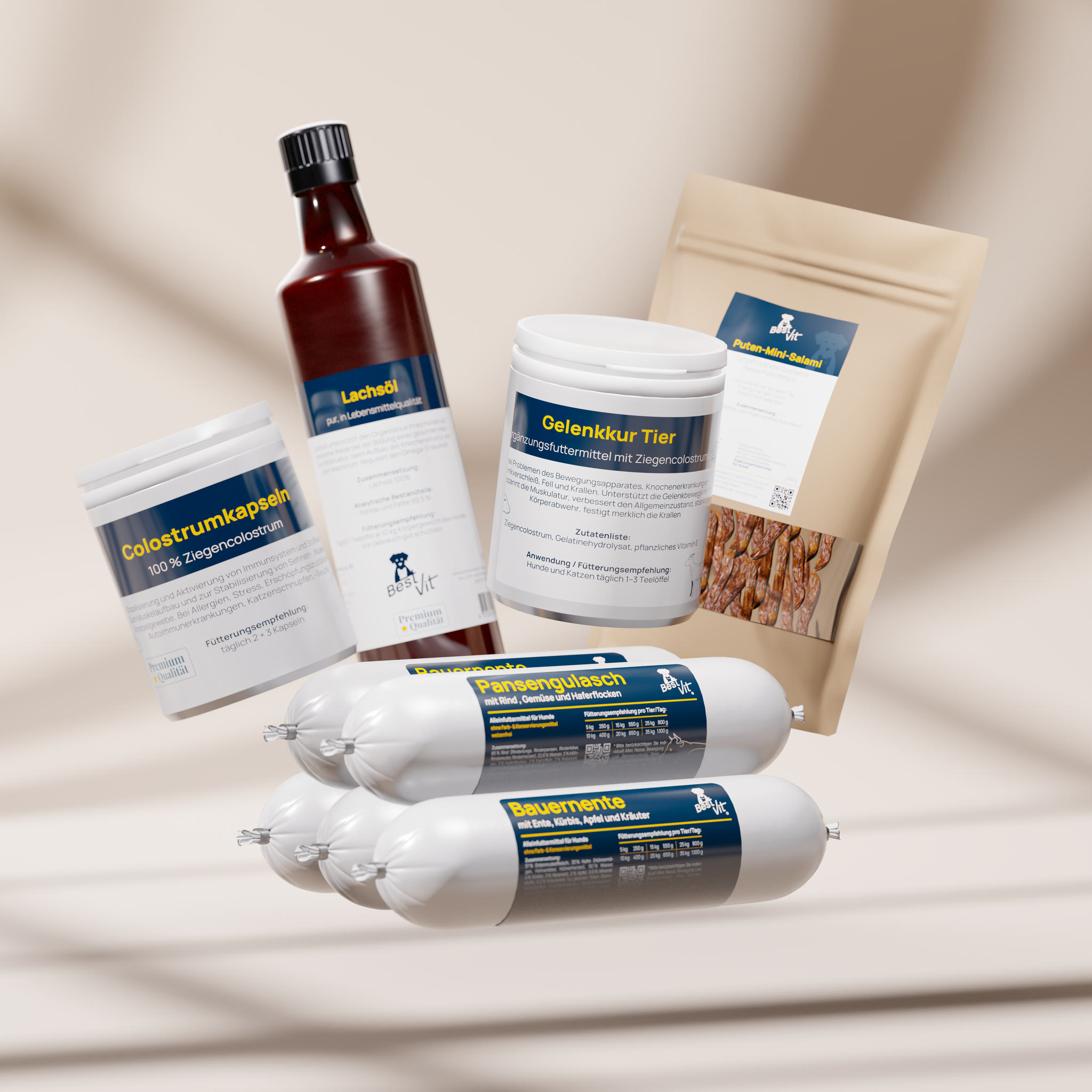 Komplett-Set für Hunde mit 30 Premium-Hundewürsten, Lachsöl 500ml , Ziegen-Colostrum 180 Stck. und Gelenkkur 90g sowie unsere Puten Mini Salamis 200g – ideal für Vitalität, Beweglichkeit und eine ausgewogene Ernährung.
