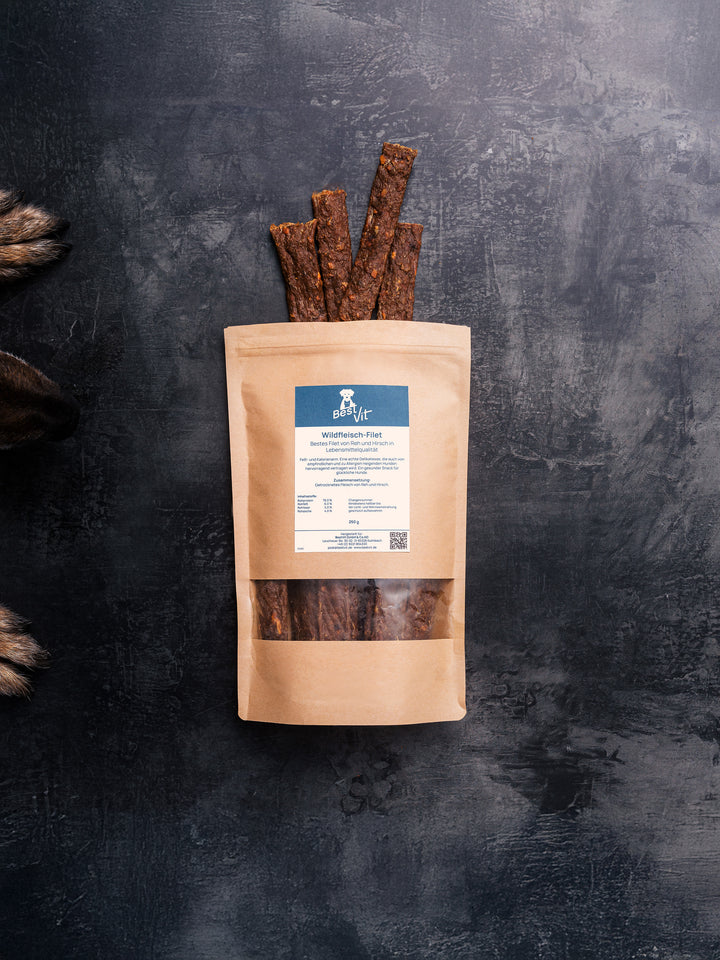 Zartes Wildfleischfilet aus Reh und Hirsch, schonend luftgetrocknet. Fett- und kalorienarm, aromatisch und ideal als hochwertige Belohnung für Hunde.